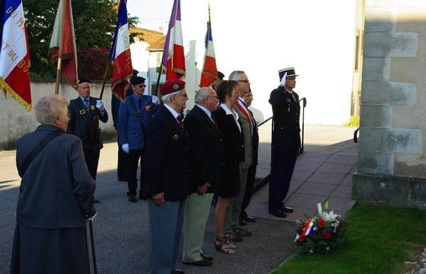 Commémoration de l' anniversire de la libération d'Archettes devant la plaque en mémoire des "morts pour la France"